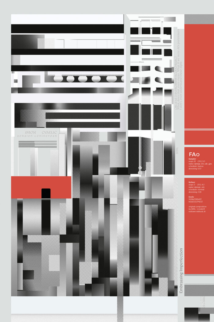 Reverse explores a deliberate inversion of authorship. Posters are first generated from minimal prompts, leaving wide creative freedom to the AI. Selected outcomes are then reworked, refined, and redrawn using traditional digital tools.